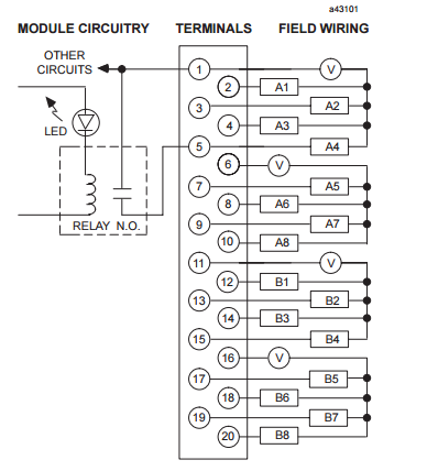 Gambar berikut memberikan informasi pengkabelan untuk menghubungkan perangkat beban yang dipasok pengguna dan sumber daya ke modul 2 output NO relay.