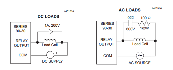 Kehidupan kontak relay, ketika beralih beban induktif, akan mendekati kehidupan kontak beban resistif jika sirkuit penindasan digunakan. Angka-angka berikut adalah contoh dari rangkaian penekanan tipikal untuk beban AC dan DC. Dioda 1A, 200V yang diperlihatkan pada sirkuit pemadatan beban DC adalah standar industri 1N4935. Resistor dan kapasitor yang ditunjukkan untuk penekanan beban AC adalah komponen standar, tersedia dari sebagian besar distributor elektronik.