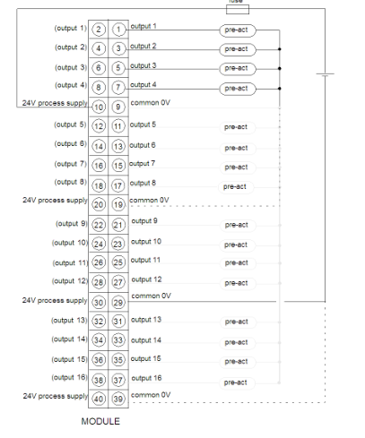 catu daya: 24 VDC sekering: 10 A max (ditentukan oleh arus beban modul), pukulan cepat pra-bertindak: pra-aktuator CATATAN: Hanya ada satu kelompok 16 output. Semua 24 V umum adalah internal terhubung dan semua 0V umum juga terhubung secara internal. Untuk aplikasi keamanan, dianjurkan untuk menghubungkan setidaknya 2 garis tanah (umum 0V) ke kabel lapangan blok terminal. Dua pin input yang sama (misalnya. Pin 1 dan 2 untuk input 1) adalah juga terhubung secara internal sehingga Anda dapat menggunakan pin kanan atau kiri