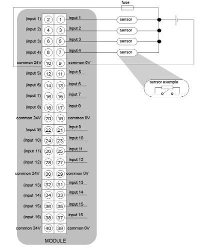 CATATAN: Hanya ada satu kelompok dari 16 input. Semua 24 V umum terhubung secara internal dan semua 0 V umum juga terhubung secara internal. Dua pin dari input yang sama (misalnya pin 1 dan 2 untuk input 1) juga secara internal terhubung sehingga Anda dapat menggunakan pin kanan atau kiri.