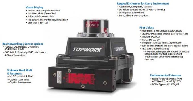 Pengontrol katup diskrit TopWorx ™ mengaktifkan katup aktif / nonaktif untuk berkomunikasi melalui FOUNDATION Fieldbus, DeviceNet, AS-Interface, Profibus, HART, dan protokol Wireless HART. Mereka melekat pada semua katup dan aktuator berputar dan linier, beroperasi dalam kondisi lingkungan yang paling menuntut, dan membawa berbagai sertifikasi area berbahaya.
