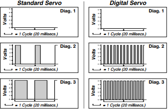 Pertama-tama, 'servo digital' sama dengan servo standar, kecuali untuk mikroprosesor, yang menganalisis sinyal penerima yang masuk dan mengendalikan motor. Tidak benar untuk percaya bahwa servos digital berbeda secara drastis dalam desain fisik dengan yang standar. Servo digital memiliki motor, persneling dan casing yang sama dengan servos standar dan mereka juga, yang paling penting, memiliki Potensiometer Umpan Balik (Pot) sama seperti rekan-rekan standar mereka. Dimana servo digital berbeda, adalah cara memproses informasi penerima yang masuk, dan pada gilirannya mengontrol daya awal ke servomotor, mengurangi deadband, meningkatkan resolusi dan menghasilkan daya holding yang luar biasa.