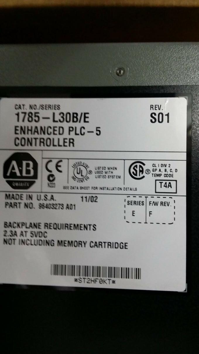 Pengontrol yang dapat diprogram, 1785-L30B adalah bagian utama dari setiap sistem kontrol yang ditingkatkan berdasarkan seri Allen Bradley PLC-5. The 1785-L30B menggabungkan modul I / O lokal, diperluas dan jauh pada berbagai jenis antarmuka komunikasi menjadi satu sistem kontrol yang cocok untuk berbagai proses. 1785-L30B memiliki dua port bawaan. Port ditandai sebagai saluran 1A dan saluran 1B, dan keduanya dapat berfungsi sebagai pemindai I / O jarak jauh, adaptor I / O jarak jauh, dan antarmuka komunikasi DH +. Komunikasi DH + dapat bekerja baik untuk pemrograman jarak jauh dan pemantauan 1785-L30B, dan untuk menciptakan jaringan komunikasi peer-to-peer antara pengontrol PLC-5 lainnya. Koneksi I / O jarak jauh digunakan untuk pertukaran data waktu-nyata antara pengontrol dan I / O, antarmuka operator, dan perangkat lainnya. Pada panel depan pengontrol 1785-L30B, terdapat konektor 25-pin bertanda saluran 0. Ini adalah port EIA RS232C yang terisolasi secara optik. Saluran 0 mendukung protokol master ASCII dan DF1 full dan half-duplex dan half-duplex slave. Di panel depan, ada lampu indikator komunikasi 0 saluran hijau. Dekat saluran 0, ada konektor mini-DIN 8-pin yang ditandai sebagai saluran 1A, dan koneksi terminal pemrograman DH + yang paralel dengannya. Ada dua konektor tiga pin yang berfungsi sebagai port komunikasi. Ketiga konektor pin ini digunakan untuk saluran 1A dan 1B, yang dapat dikonfigurasikan sebagai pemindai I / O jarak jauh, adaptor I / O jarak jauh atau port komunikasi DH +. Saluran 1A dan saluran 1B pada 1785-L30B dapat berfungsi sebagai pemindai I / O jarak jauh atau komunikasi adaptor I / O jarak jauh. Mode Pemindai I / O jarak jauh membaca dan menulis informasi I / O antara pengontrol dan perangkat I / O jarak jauh. Dalam mode ini, 1785-L30B adalah pengontrol pengawasan untuk pengontrol lain yang berada dalam mode adaptor dan modul adaptor I / O jarak jauh. Ketika saluran 1A atau 1B berada dalam Mode Adaptor I / O Jarak Jauh, saluran itu mengontrol I / O lokal yang berada di kontroler sambil berkomunikasi dengan pengawas pengawasan melalui tautan jarak jauh. Pada 1785-L30B, tautan Data Highway Plus (DH +) dapat berfungsi baik pada saluran 1A dan 1B. Komunikasi DH + dapat digunakan untuk transfer data ke pengontrol PLC-5 lainnya atau komponen tingkat tinggi dari sistem kontrol. Tautan DH + dapat memprogram banyak pengontrol PLC-5. Panjang kabel maksimum untuk tautan DH + tergantung pada kecepatan transmisi. Sangat penting bahwa semua perangkat pada tautan DH + dikonfigurasikan untuk berkomunikasi pada tingkat transmisi yang sama. 1785-L30B memiliki beberapa indikator pada panel depan yang digunakan untuk memudahkan interaksi dengan pengguna. Indikator digunakan untuk menampilkan berbagai status pengontrol. Indikator bertanda BATT menampilkan status baterai. Indikator bertanda PROC menunjukkan mode pengontrol saat ini, berwarna hijau ketika pengontrol dalam mode RUN, dan merah ketika ada sesuatu yang salah. Indikator FORCE berwarna kuning ketika pasukan I / O diaktifkan. Indikator COMM ditautkan dengan saluran 0. Berwarna hijau ketika saluran berkomunikasi. Saluran 1A dan 1B keduanya memiliki indikator status khusus.
